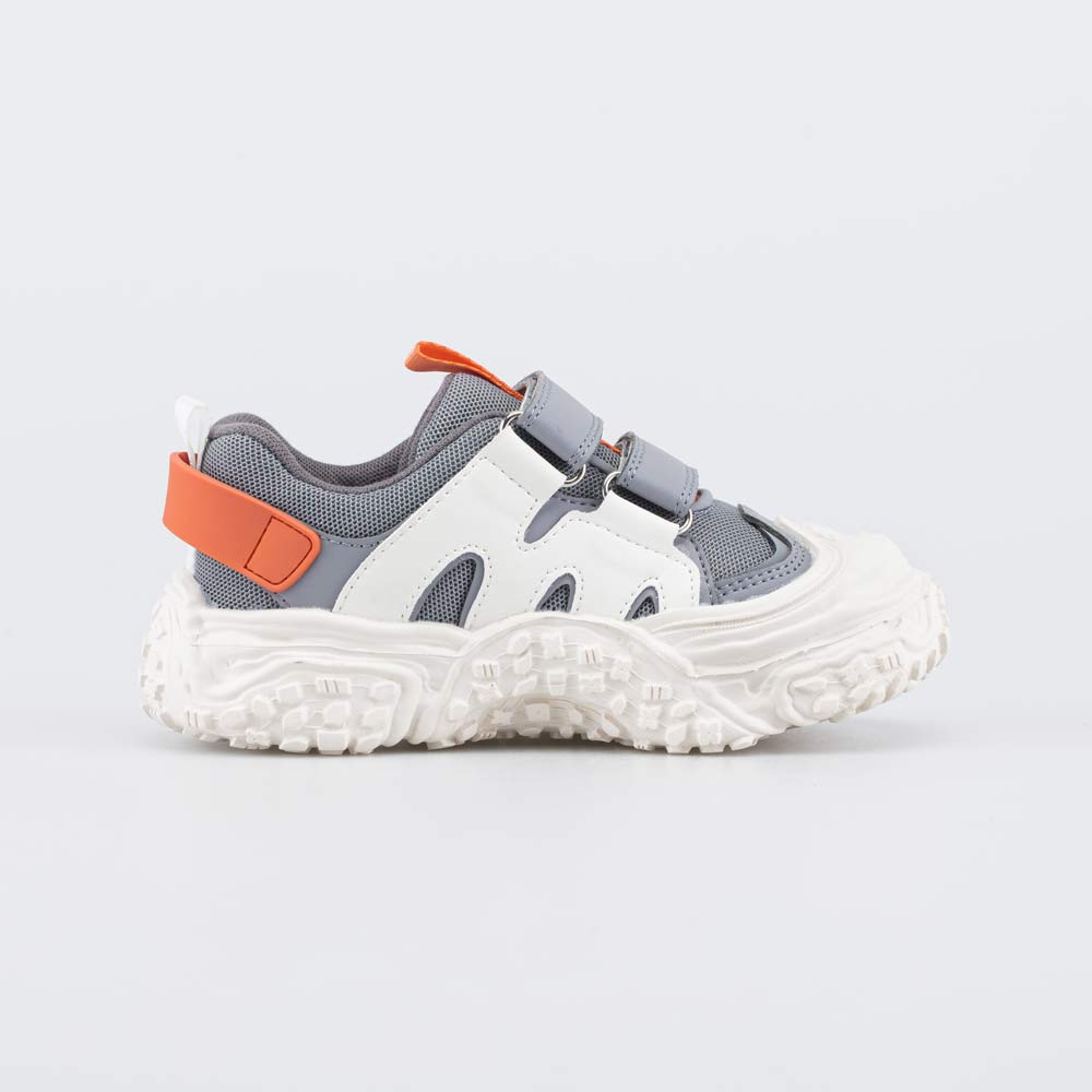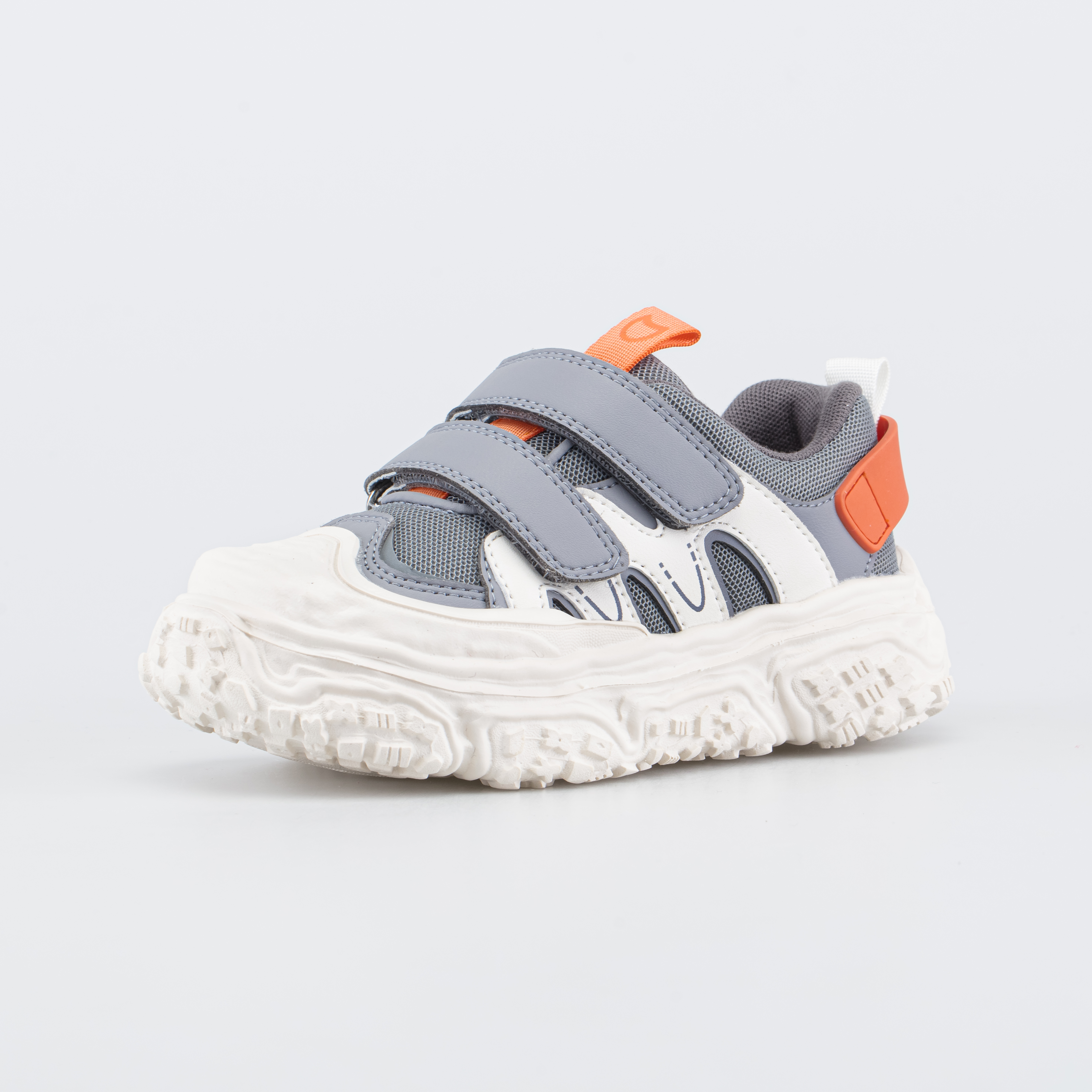Детские серые кроссовки, привлекающие внимание необычной фактурой подошвы, подходят для мальчика дошкольного возраста.