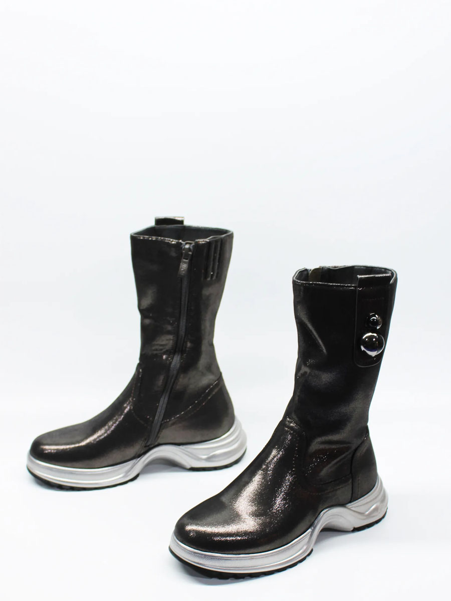 33 (215 мм), 34 (220 мм), 36 (235 мм) Полу сапоги демисезонные идеальный выбор для девочек школьного возраста, которые ценят комфорт и стиль. Модель выполнена из качественной экокожи серебристо-коричневого цвета с эффектом металлика, что придает им особый шик. Удобная застежка-молния позволяет быстро и легко обуть сапоги, а закрытый, круглый мысок защищает ножки от холода и механических повреждений. Теплая подкладка из натуральной шерсти и легкая, но при этом теплая подошва из ТПР обеспечат комфорт в прохладную погоду, как ранней весной, так и поздней осенью, а также в теплую зиму. Высота голенища 24 см и обхват 28 см гарантируют надежную фиксацию на ноге. Эти полу сапоги станут прекрасным дополнением как к повседневному образу, так и к праздничному наряду.