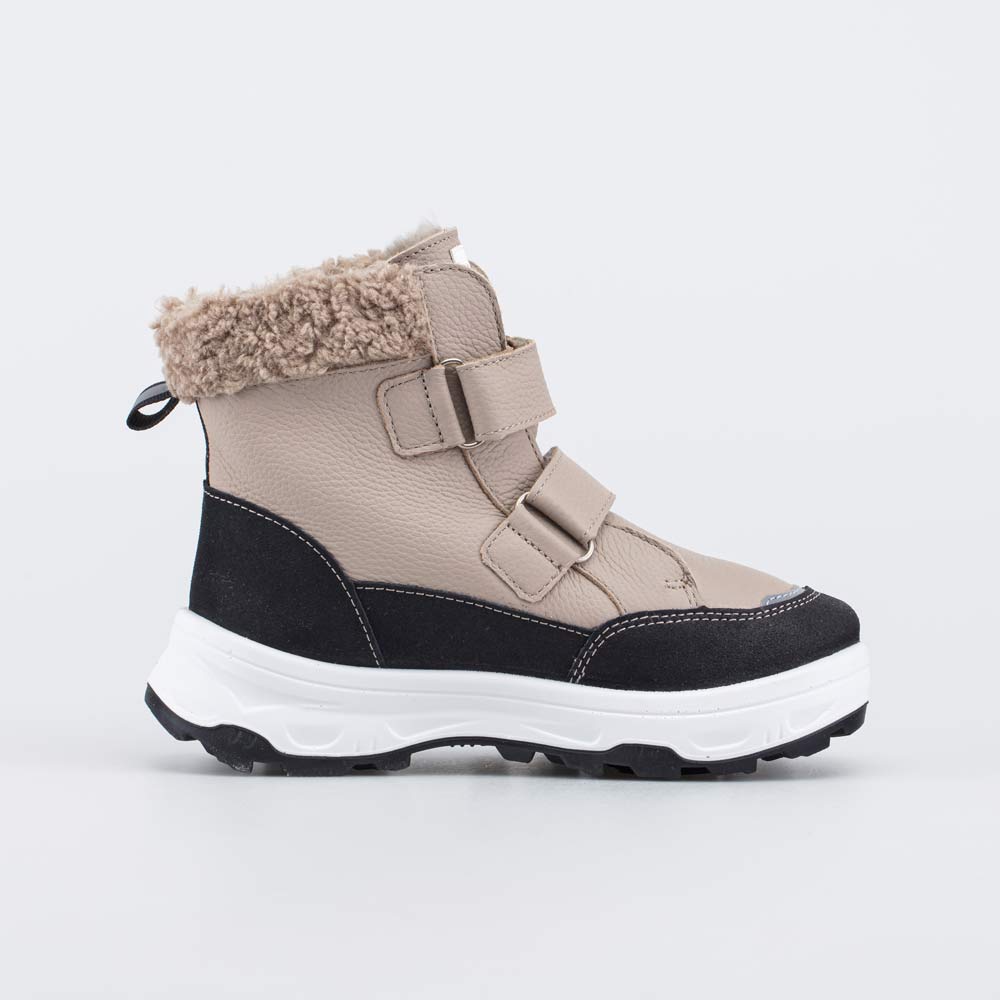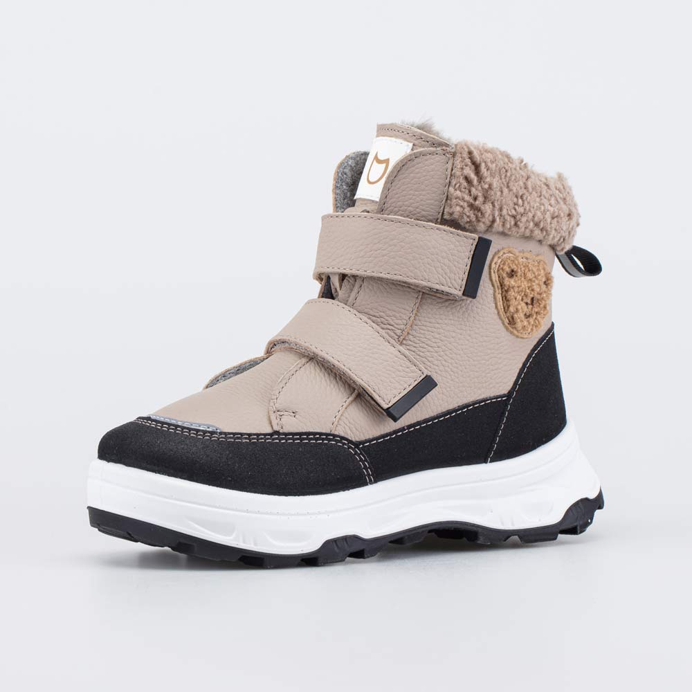 Верх детских ботинок выполнен из натуральной кожи бежевого цвета. По всему периметру вдоль подошвы модель защищена дополнительной кожаной накладкой с полиуретановым покрытием.