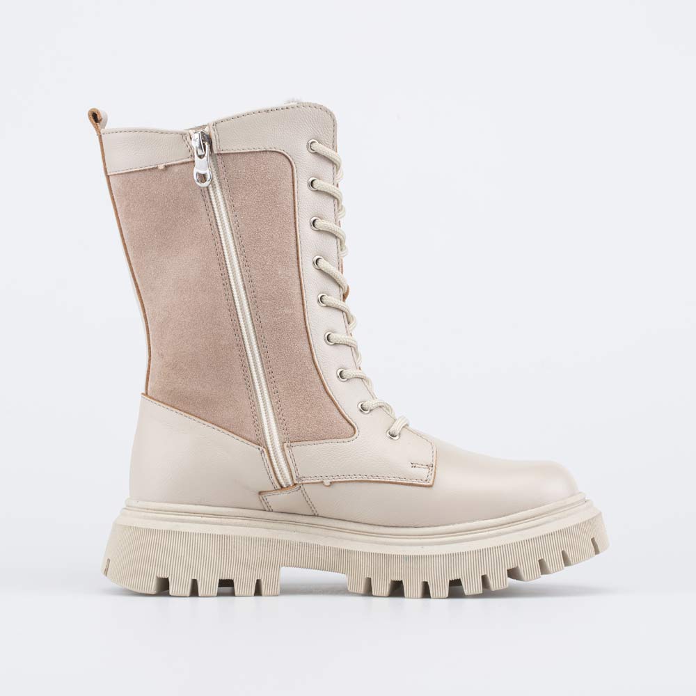 Зимние сапожки бежевого цвета на овчине подходят для девочки.
