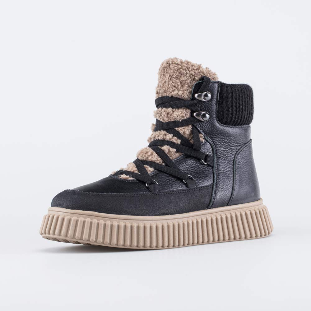 Верх выполнен из натуральной кожи черного цвета. Изюминкой модели становится язычок из мягкого и уютного искусственного меха. Тему тактильности продолжает текстильный манжет.