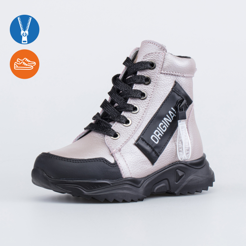 Ботинки очень красивые: нашивка с декоративной молнией и надписью ORIGINAL, блестящие черные шнурки. Носочная и пяточная части обуви усилены дополнительной накладкой из кожи.