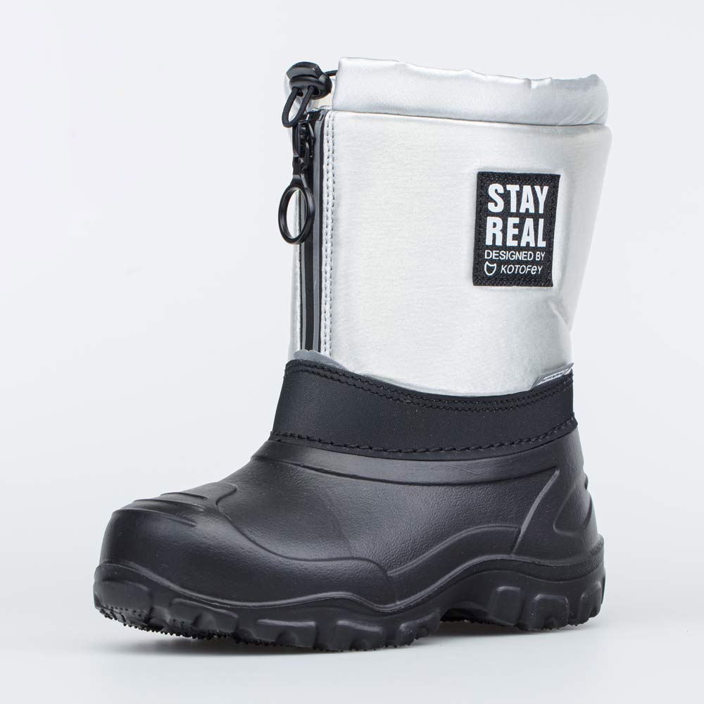 Сапожки серебристого цвета декорированы нашивкой и оснащены светоотражающими элементами.