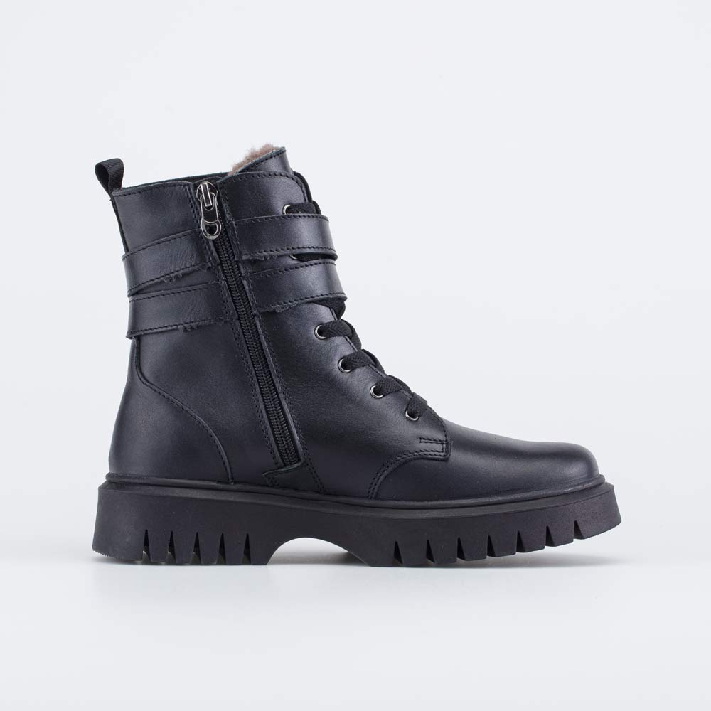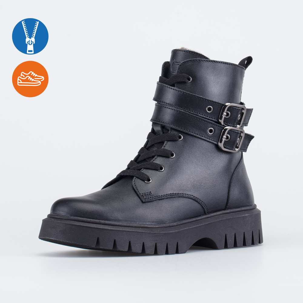 Высокие зимние ботинки для девочки, декорированные двумя ремешками с пряжками, походят для девочки школьного возраста. Лаконичный дизайн позволяет сочетать их с разными образами.