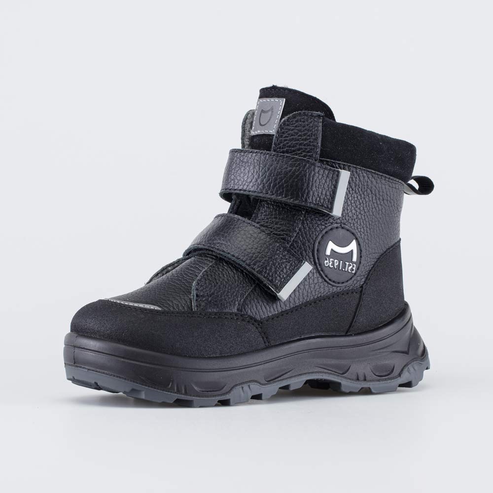 Детские зимние ботинки на овчине, декорированные нашивкой с логотипом Котофей, походят для мальчика.