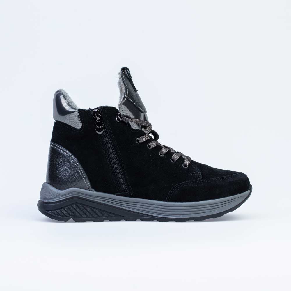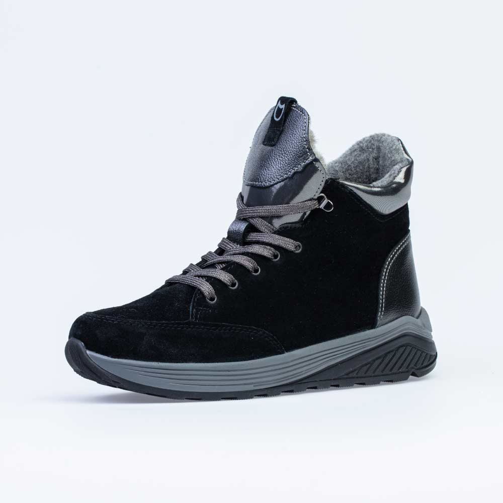 Серебристые шнурки на черных ботинках дают возможность максимально точно отрегулировать зимнюю обувь по подъему стопы.