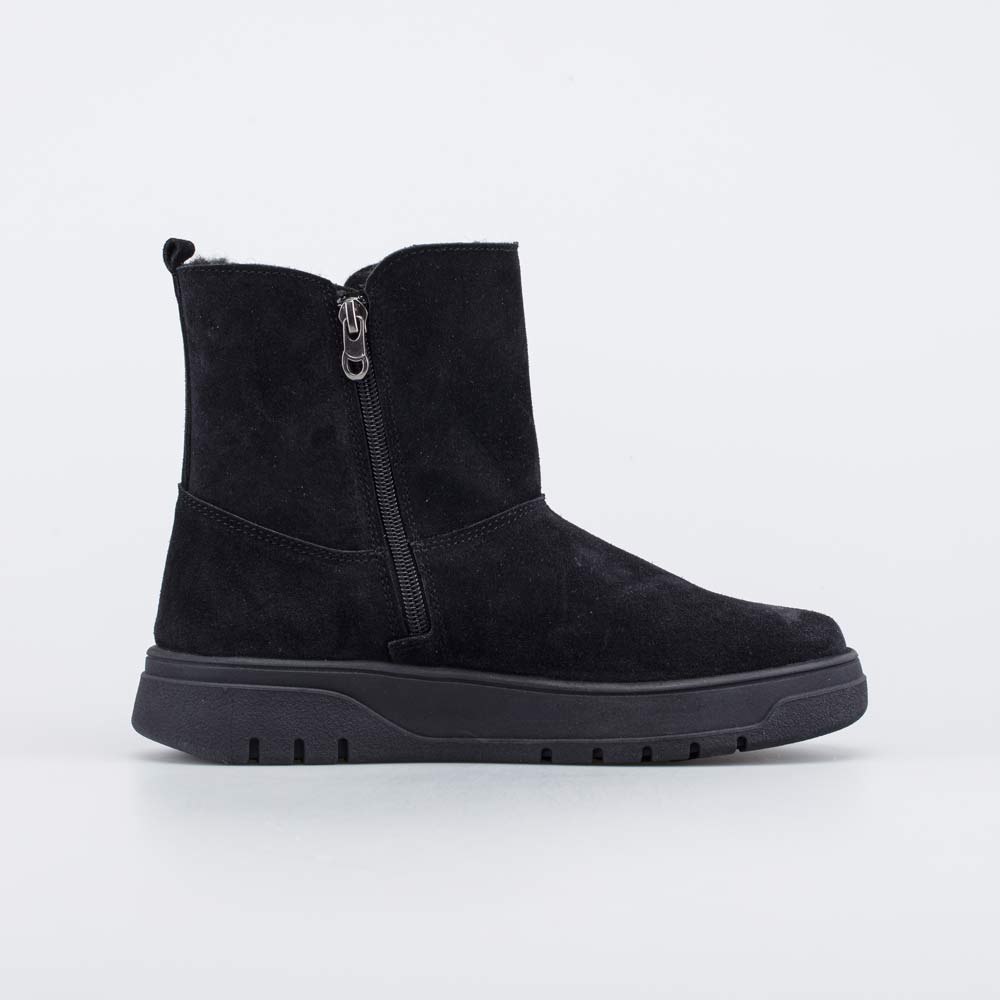 Зимние сапожки черного цвета выполнены с применением технологии дабл-фейс (в районе голенища), когда натуральная овчина поворачивается мехом внутрь, к ножкам, кожей – наружу.