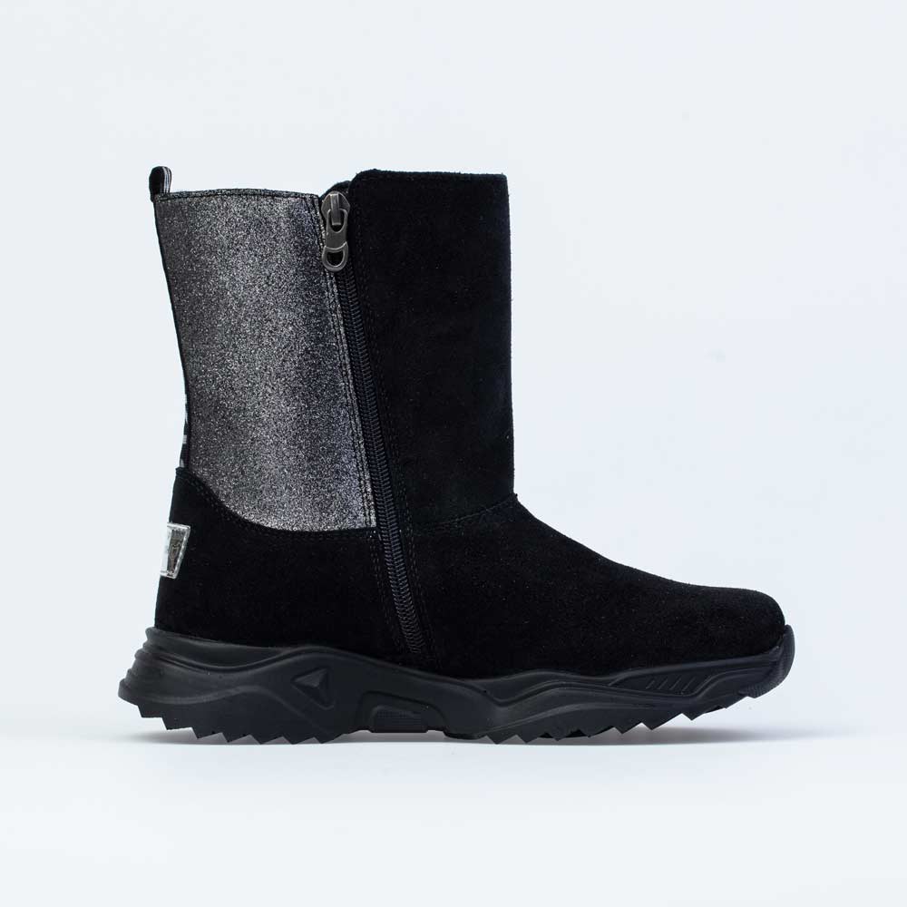 Зимние сапожки изготовлены из натурального велюра черного цвета.