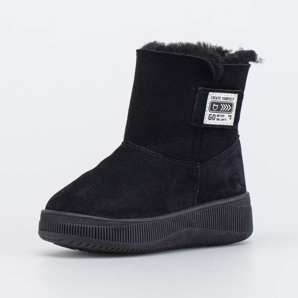 Зимние сапожки черного цвета выполнены с применением технологии дабл-фейс (в районе голенища), когда натуральная овчина поворачивается мехом внутрь, кожей – наружу.