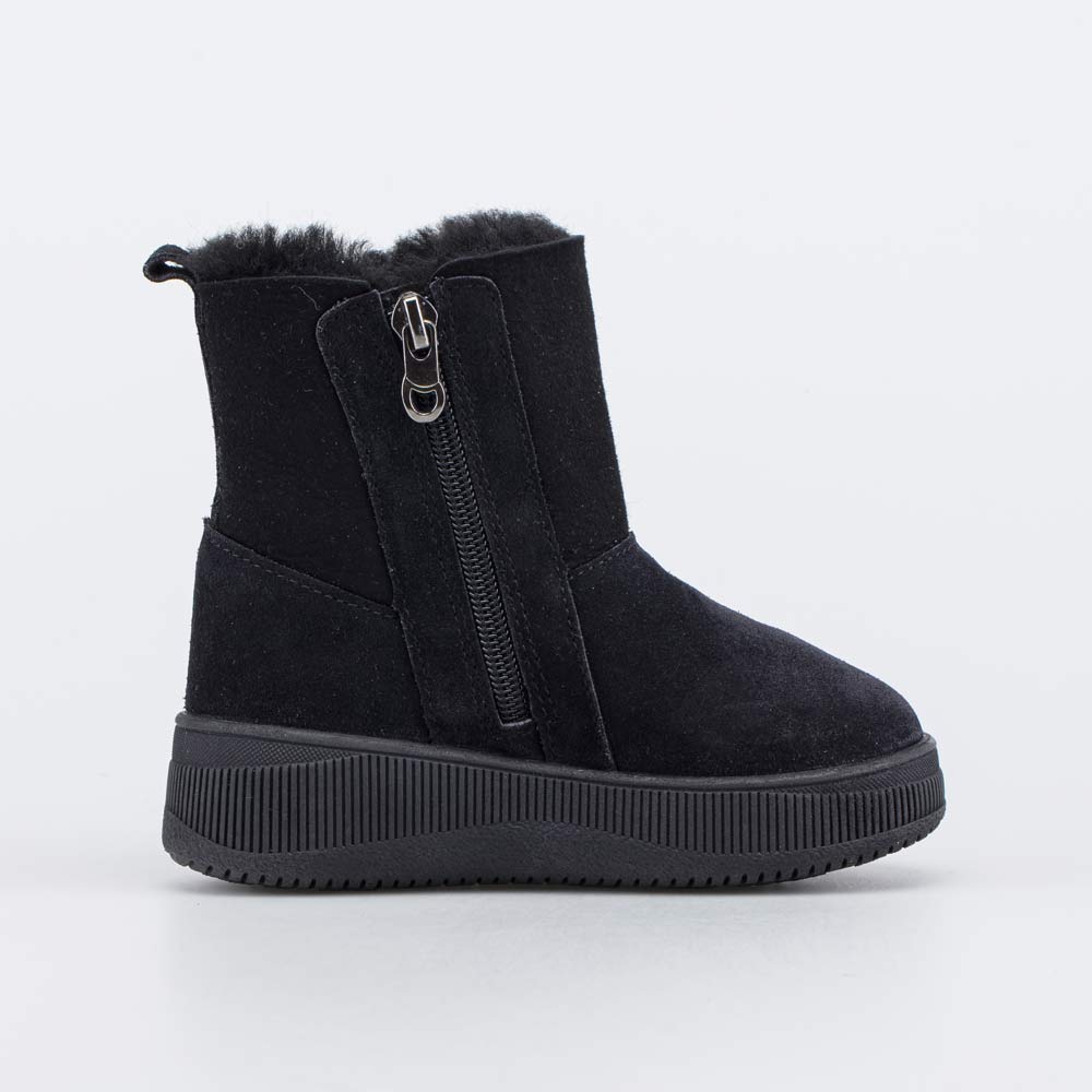 Меховые сапожки на молнии удобно обувать, а ремешок с липучкой позволяет подогнать обувь по ноге.