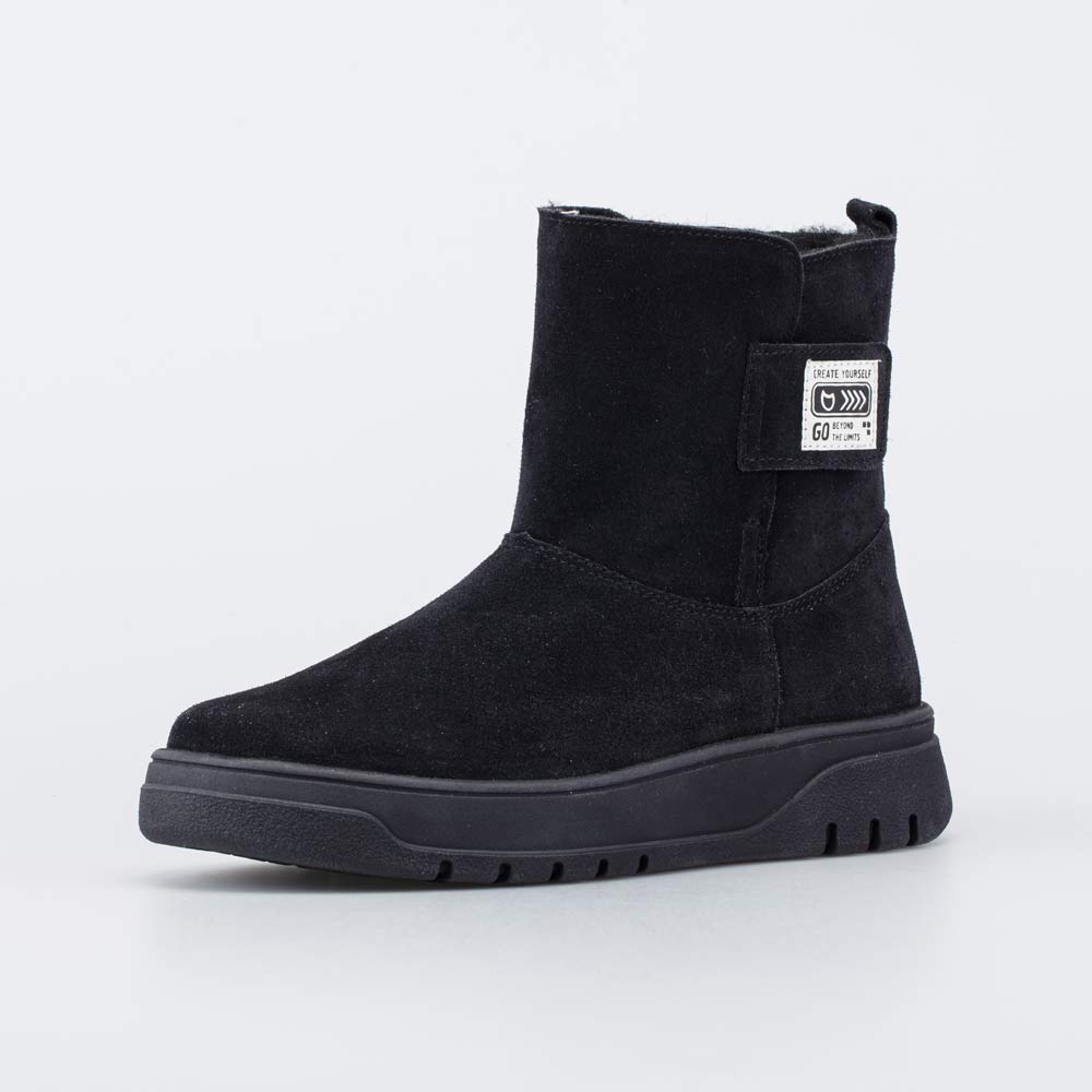 Верх коротких сапожек для девочки изготовлен из натуральной кожи-велюра и украшен ненавязчивой нашивкой.