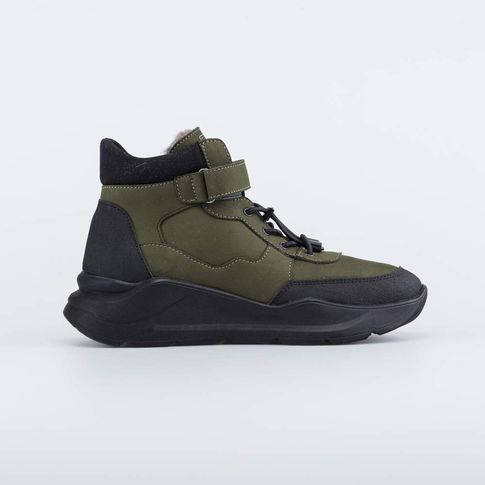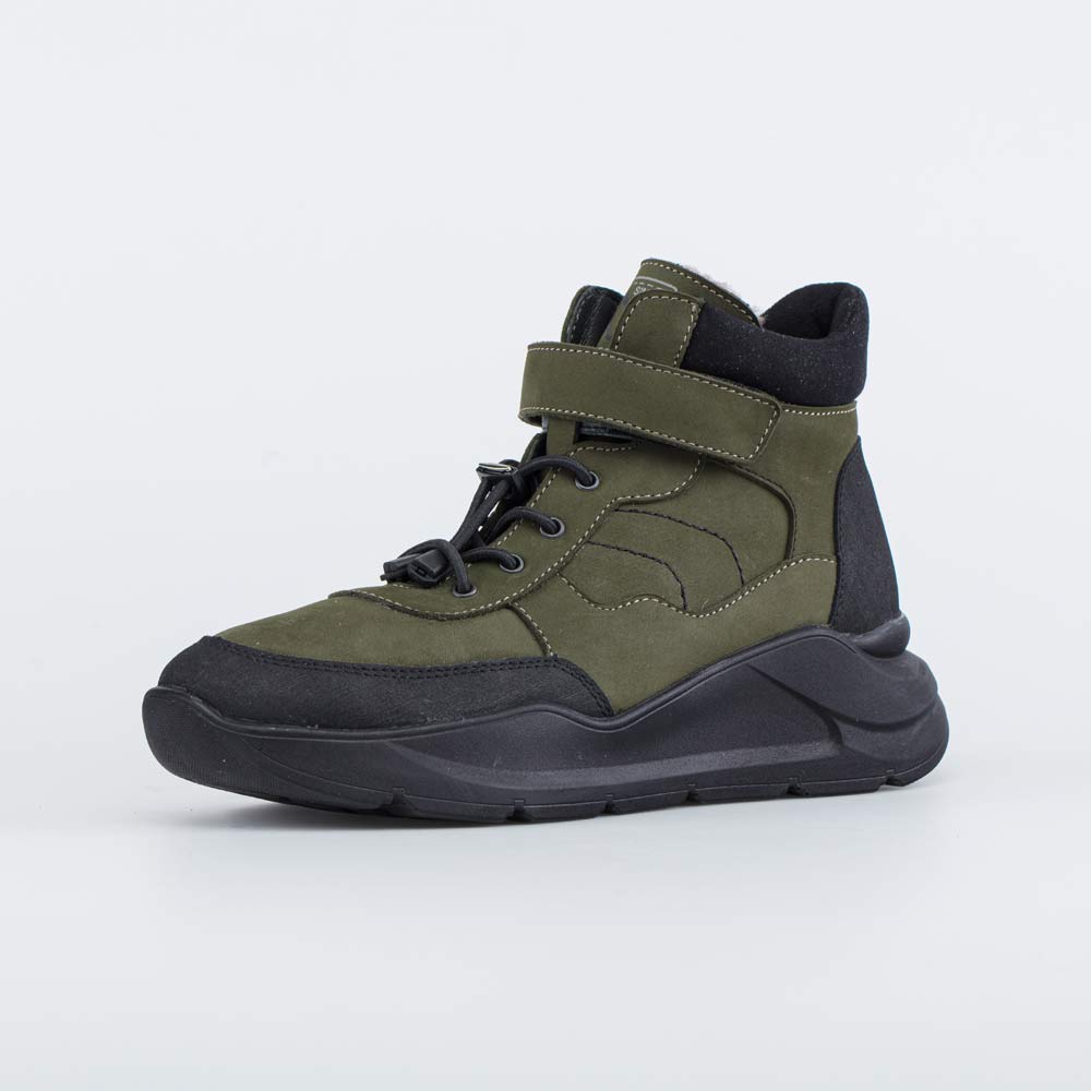 Кожаные зимние ботинки для мальчика на натуральном меху оливкового цвета