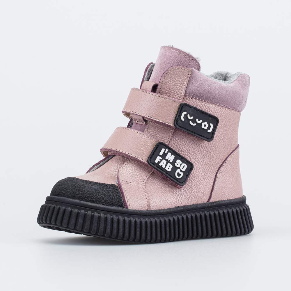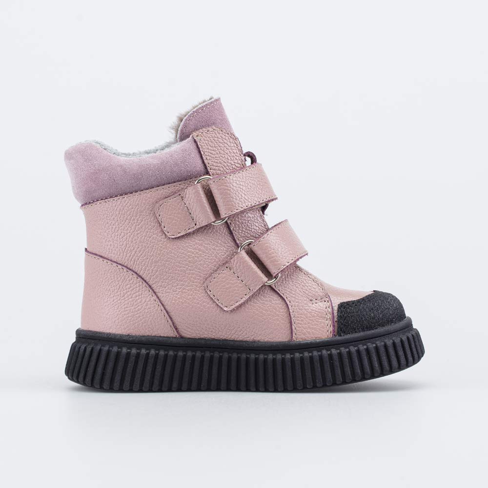 Верх этих детских ботинок изготовлен из натуральной гладкой кожи розового цвета. Носочная часть усилена дополнительной кожаной накладкой с полиуретановым покрытием, выполненной в контрастном черном цвете. Она защищает обувь от повреждений.