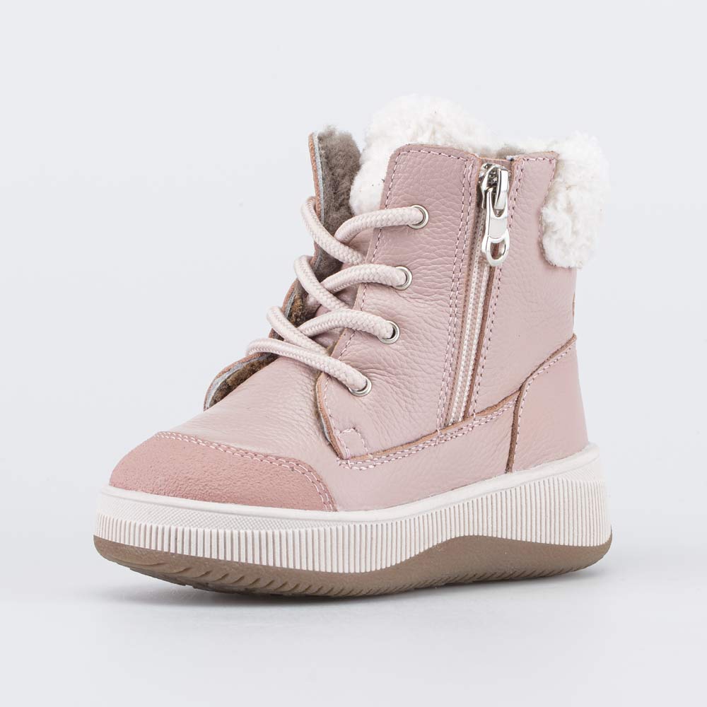 Верх этих детских ботинок выполнен из натуральной кожи и украшен кудрявым мехом барашек. Носочная часть усилена дополнительной кожаной накладкой с полиуретановым покрытием.