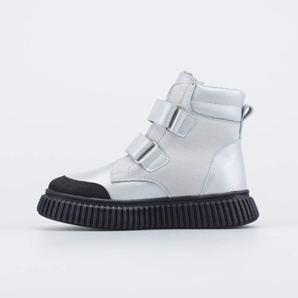 Верх выполнен из натуральной гладкой кожи серебристого цвета. Носочная часть защищена кожаной накладкой с полиуретановым покрытием, предохраняющей обувь от реагентов и повреждений.