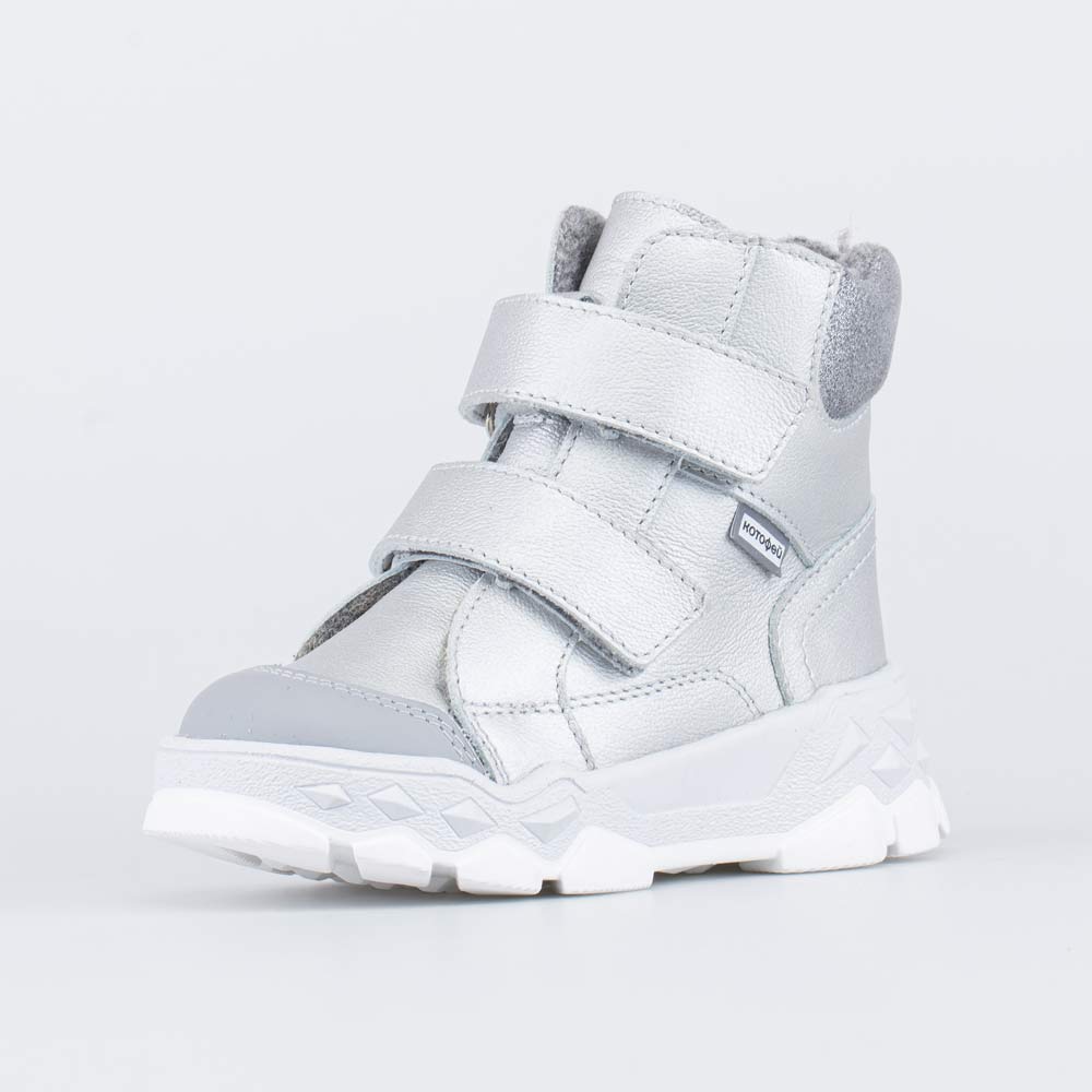 Зимние ботинки на липучках подходят для девочки, которая только начинает ходить. Верх и классический язычок выполнены из натуральной гладкой кожи серебристого цвета.