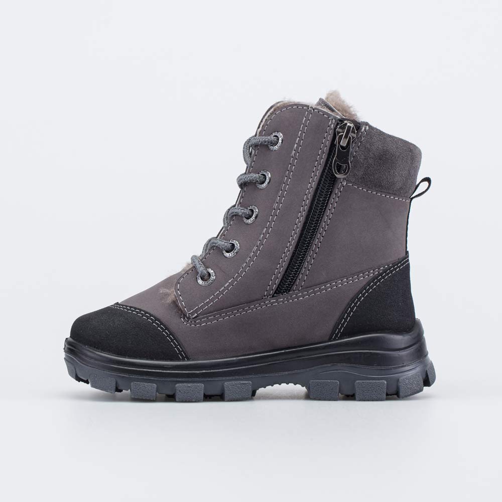 Зимние ботинки на натуральном меху серого цвета выполнены из натуральной кожи-нубука, подходят для мальчика, который только начинает ходить.