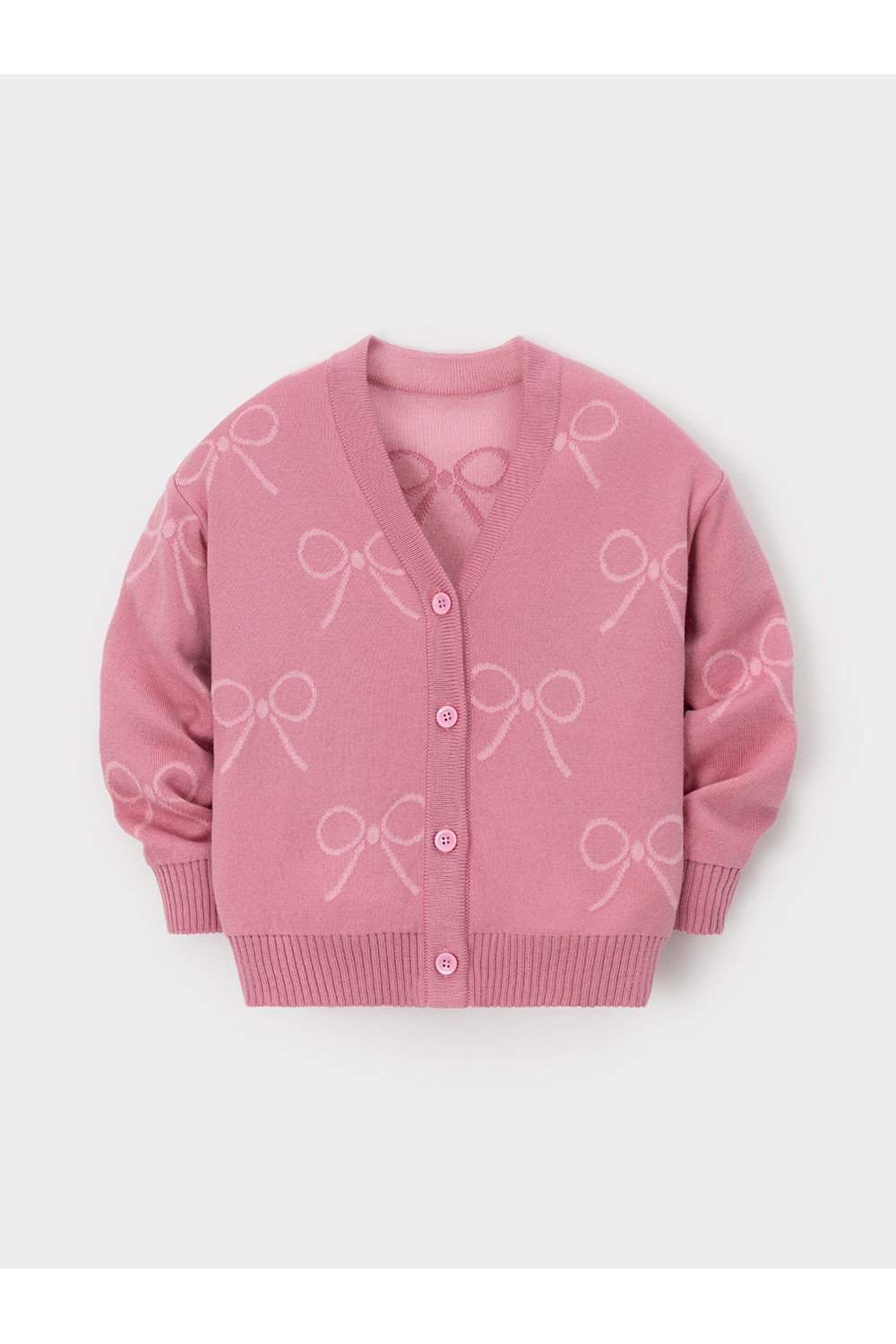 Вязаный кардиган с бантиками для девочки. Изготовлен из мягкой хлопковой пряжи с добавлением акрила. Застёгивается на планку с пуговицами. Длинные рукава с манжетами. Внизу эластичный пояс. Изделие сохраняет форму и стойкий цвет после многочисленных стирок.