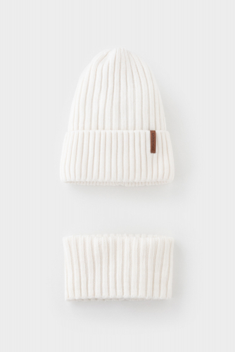 Комплект зимний детский: шапка и снуд из полушерсти. Тёплая вязаная шапка с отворотом на подкладе из флиса. Украшена нашивкой из искусственной кожи. Узкий снуд без оборотов вокруг шеи. Изделие сохраняет форму и стойкий цвет после многочисленных стирок.