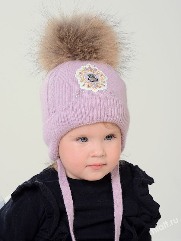 Зимняя шапочка для девочки до 5 лет. В отворот, связанный в резинку, вшиты завязки. Утеплитель и хлопковая подкладка гарантируют сохранение температурного баланса. Помпон из натурального меха енота крепится кнопкой. Декорирована аппликацией с медвежонком, расшитой бусинками. Стразы и  камень  в оправе дополняют композицию.