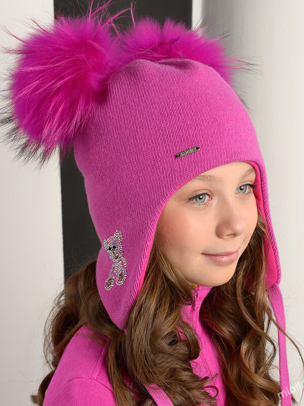 Дополнение: Подкладка, утеплитель, кроеные длинные "уши", завязки. Помпоны из натурального меха на кнопке. Декор- стразовые композиции симметрично справа и слева