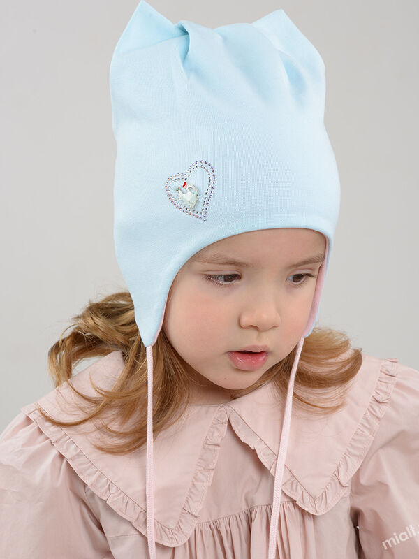 Дополнение: Двухслойная шапочка с контрастной подкладкой. "Кошачьи" ушки, завязки из вязанного в тон подкладки шнура. Декор- стразовая композиция, подвеска