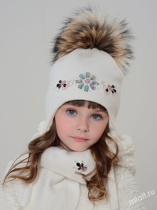 Дополнение: Для девочки. Шапка+шарф. Удлиненная форма.Завязки. Декорирована Стразовой композицией.Помпон из меха на кнопке. Утеплитель. Подкладка. Шарф р. 122*15 Декор- стразовая композиция.