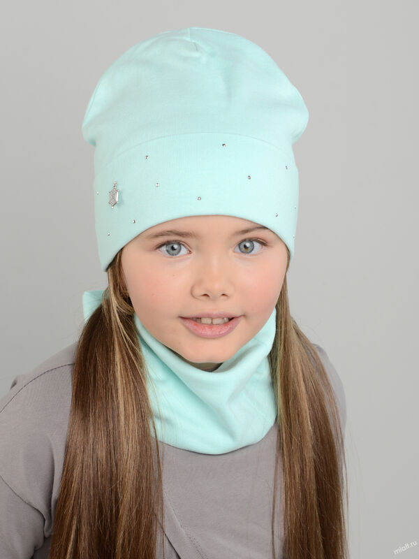 Дополнение: Комплект шапка+шарф-труба. Шапка двухслойная, из тонкого эластичного полотна, с двойным отворотом. Декор- стразы, подвеска