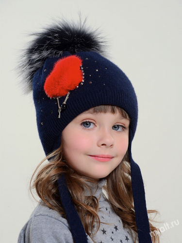 Шапочка с завязками для девочки дошкольного возраста. Особенно комфортна благодаря хлопковой подкладке. Не продувается ветром за счет утеплителя.  Помпон из натурального меха енота крепится кнопкой. Оригинальный декор из аппликации меха норки в виде сердца окантованного стразами и подвески. В комплект можно подобрать варежки Ритм-kids