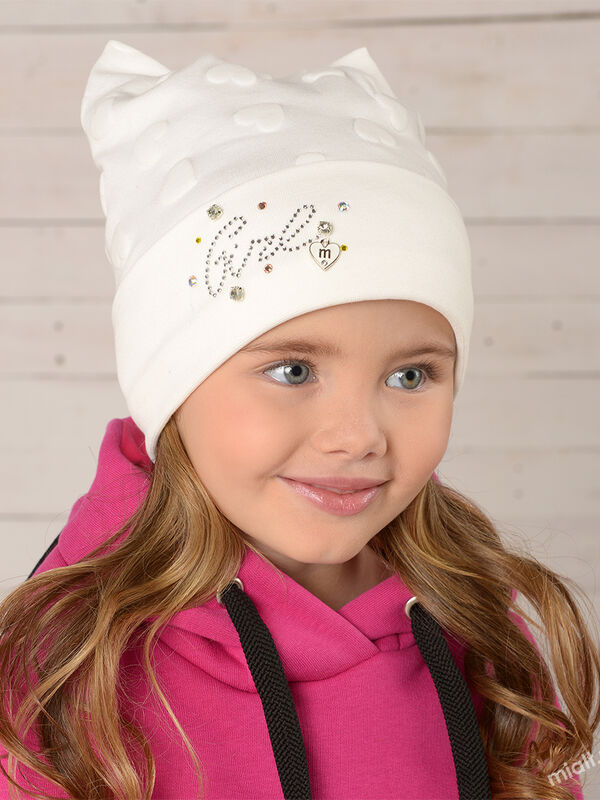 Дополнение: Модель из трикотажа с тисненым орнаментом "сердечками" с имитацией ушек и двойным отворотом однотонного трикотажа (чем отличается от модели Смешинка). На отвороте стразовая надпись.