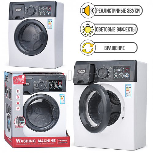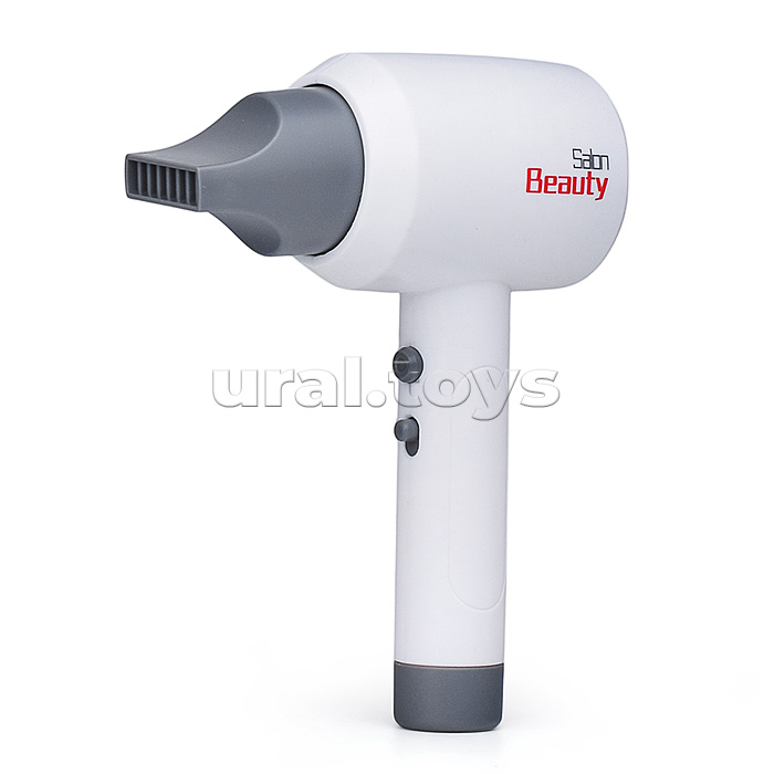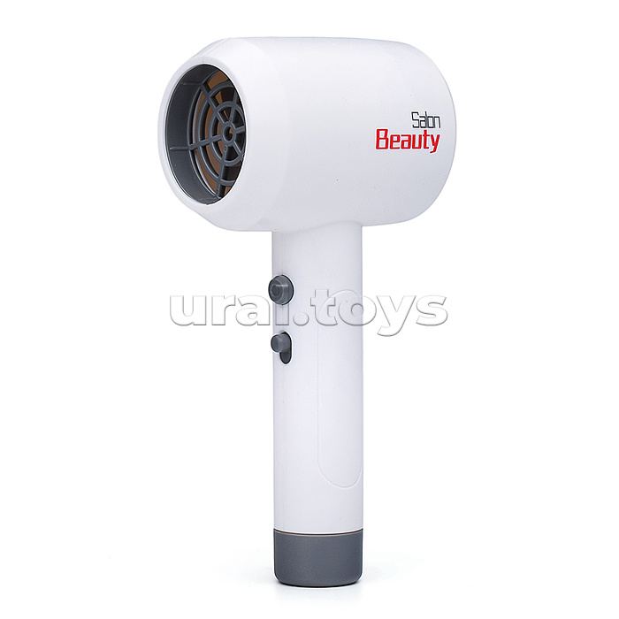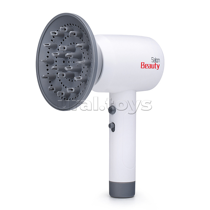 Игрушечный фен выдувает воздух, издает звук работающего прибора, насадки меняются.