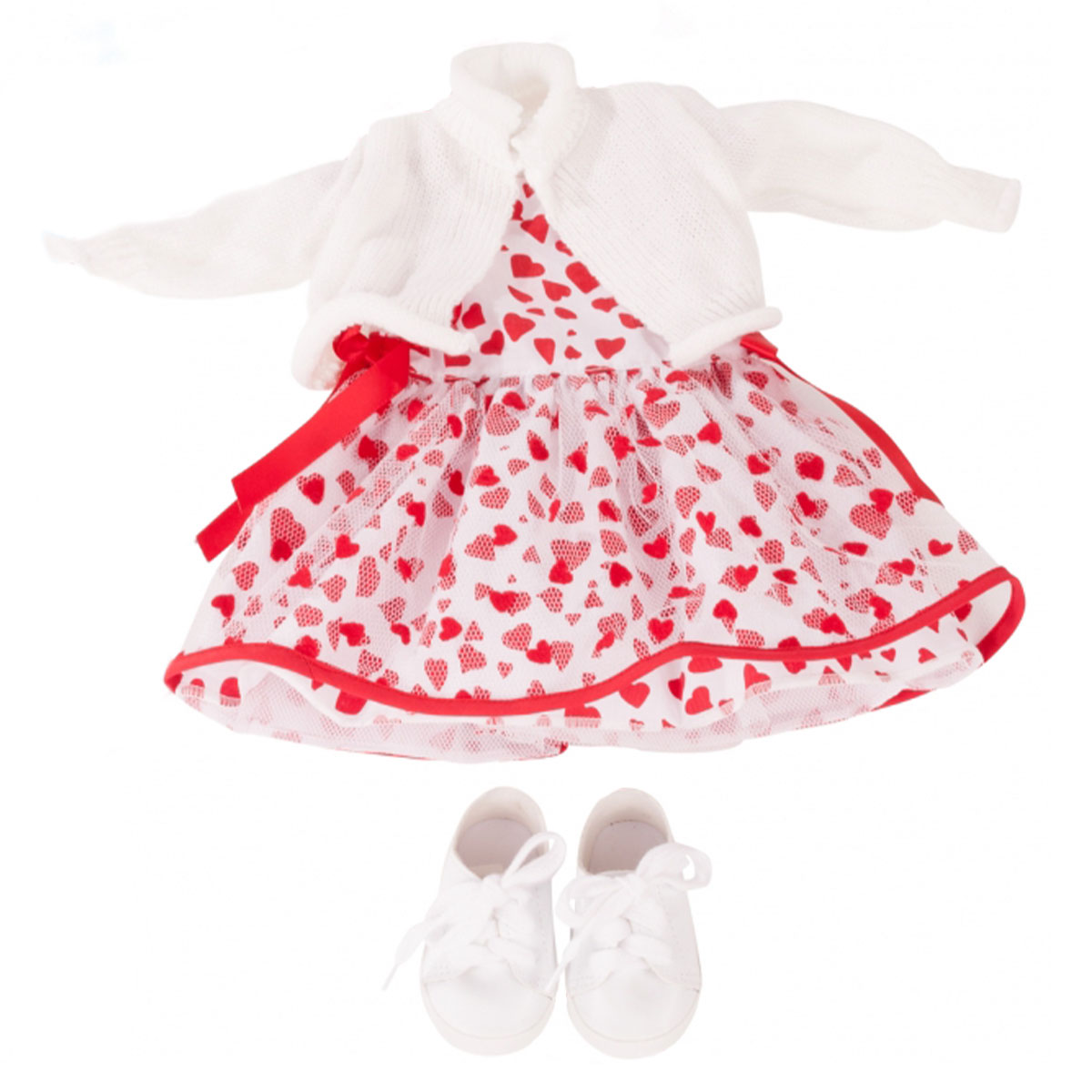 На улице становится тепло, и ваша кукла с нетерпением ждет, когда наденет этот замечательный летний комплект. Красные сердечки по всему полотну и милые детали в виде бантиков и тюля под юбкой, делают это платье особенным. Оно идеально подходит для прогулки летним вечером. С ним отлично сочетается белая вязанная куртка, которая ещё идеально подходит к белым тканевым кедам. Какая идеальная комбинация!