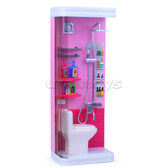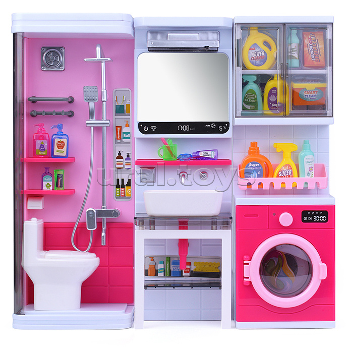 Набор мебели для кукол "Ванная" (душ, унитаз, стиральная машина, зеркало) на батарейках, розовая, в коробке