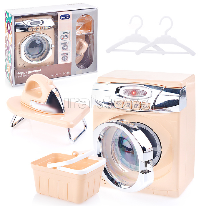 • В комплекте: игрушка "Стиральная машина", корзинка, плечики (2 шт.), доска гладильная, утюг.