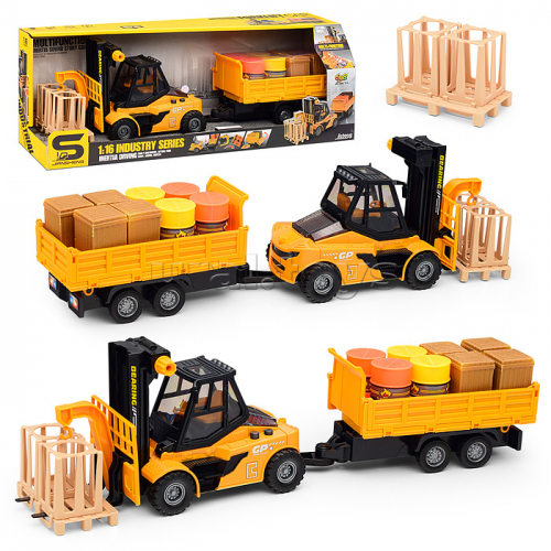 Погрузчик с прицепом и цистернами (свет, звук) в коробке (зеленый)