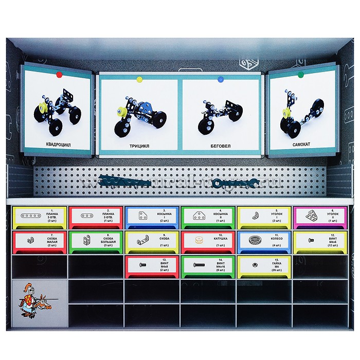 Набор дополнительных деталей к металлическому конструктору приятно порадует юных мастеров! Набор предназначен для увеличения количества элементов или восполнения утерянных деталей металлических конструкторов. Собирая модели, ребенок не только развивает усидчивость, мелкую моторику, но и знакомится с принципиальным устройством каждой модели. Очень важно, что в каждой модели подвижная передняя вилка, как в реальном аналоге. Собрав каждую из моделей, ребенок может играть с ними, представив себя владельцем квадроцикла или самоката, непосредственно управляя направлением движения модели, «держась за «руль»! В инструкции по сборке школьного металлического конструктора № 1, состоящего из 72 деталей, содержится полная деталировка, схема сборки четырех небольших и интересных моделей - беговел, самокат, квадроцикл и трицикл. Детали конструктора подходят ко всем металлическим конструкторам от Десятого королевства.