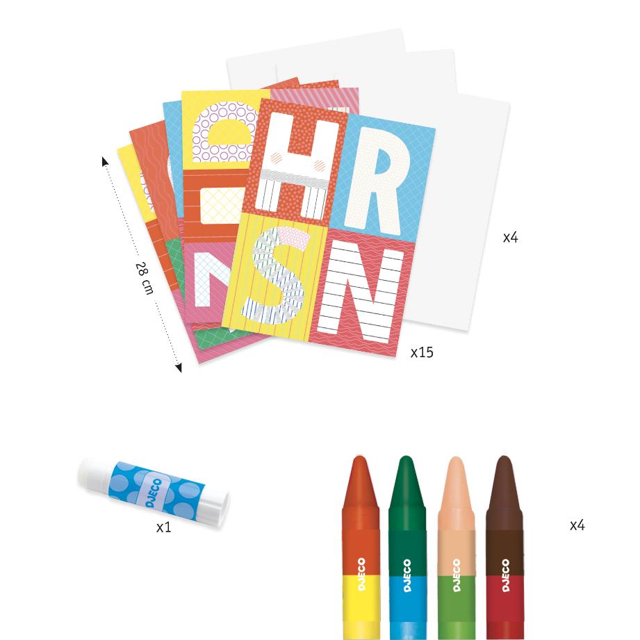 Творческий и развивающий набор для детей от 3 до 6 лет. Содержит всевозможные буквы из прочного картона, которые нужно раскрасить и украсить наклейками. Дети могут составлять из них слова и наклеивать их на сцены. Пошаговые инструкции включают несколько шаблонов.