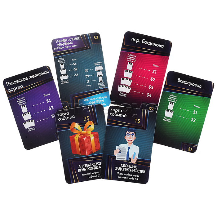 1 шт. Увлекательная карточная игра, позволяющая освоить основы экономики. Первым ходит самый младший игрок, а далее ход передаётся по часовой стрелке. Во время своего хода используй карточки Событий, выполняя указания на них, это поможет тебе собрать три полных комплекта Владений, необходимых для победы!