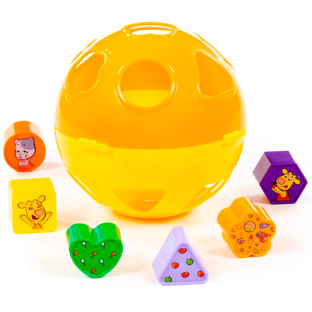 Комплектация: шар с отверстиями, 6 фигур (круг, квадрат, сердечко, треугольник, цветочек, многоугольник)