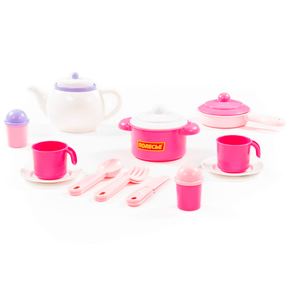 Комплектация: тарелка - 2 шт., чашка - 2 шт., ложка - 2 шт., вилка - 2 шт., нож - 2 шт., солонка - 2 шт., кастрюля - 1 шт., сковорода - 1 шт., чайник - 1 шт., крышка - 3 шт.
