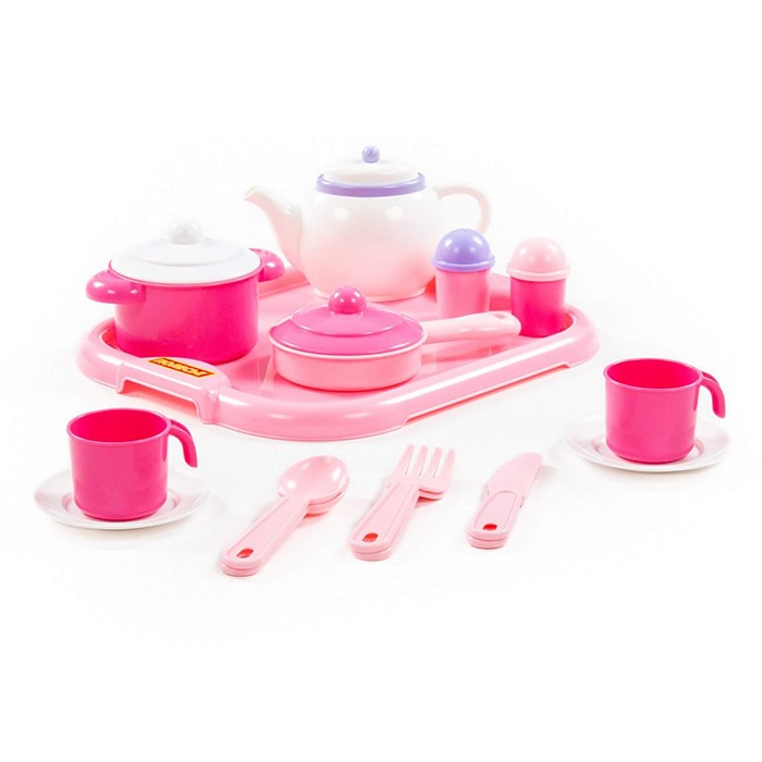 Комплектация: чашка - 2 шт.; блюдце - 2 шт.; нож- 2 шт.; ложка- 2 шт.; вилка- 2 шт.; чайник с крышкой- 1 шт.; солонка - 2 шт.; кастрюля с крышкой - 1 шт.; поднос – 1 шт.; сковорода - 1 шт.