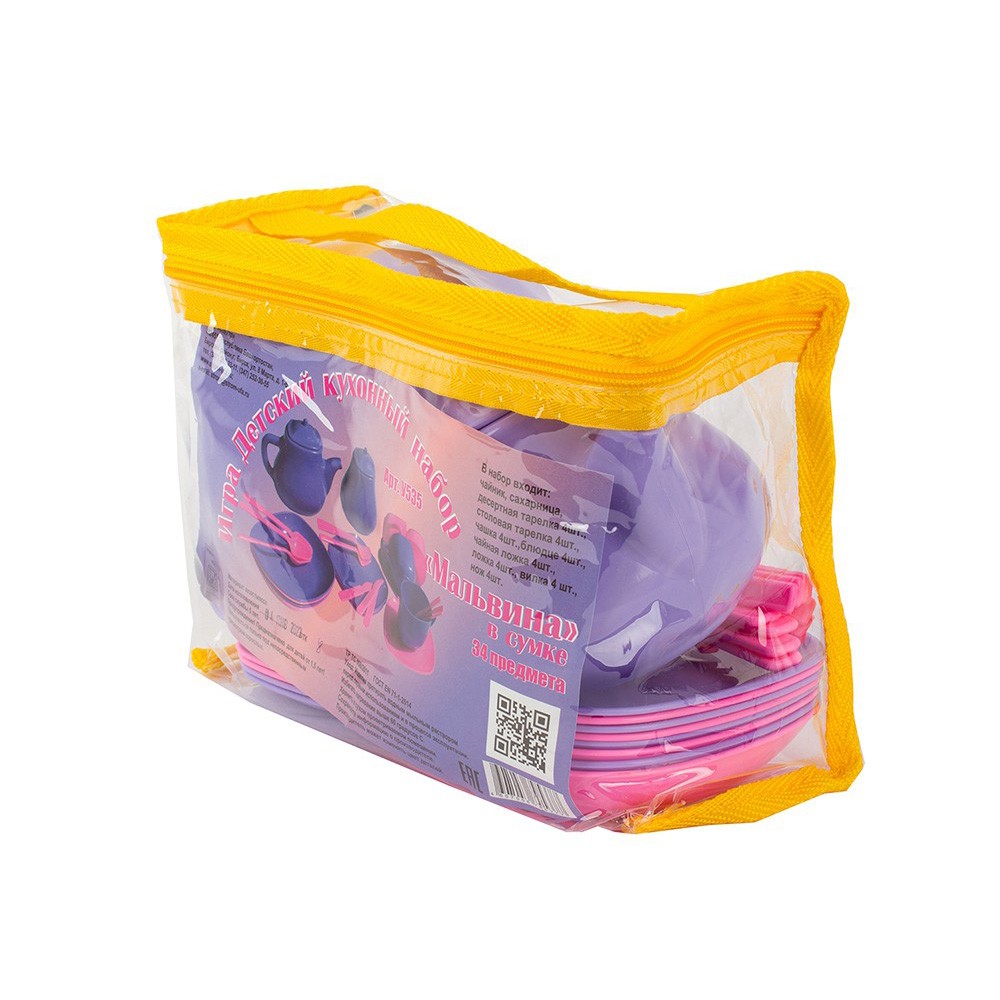 С набором игрушечной посуды "Мальвина" чаепитие с куклами и медведями станет еще более увлекательным. В набор входят чайник, сахарница, чашки, блюдца, тарелочки и столовые приборы, выполненные в сиренево-розовой цветовой гамме, которая придется по душе девочкам. Сервируя игрушечный стол, ребенок сможет не только весело провести время, но и познакомится с правилами этикета, разовьет аккуратность и узнает о правилах поведения за столом. Все элементы набора выполнены из качественного нетоксичного пластика и соразмерны детской руке.