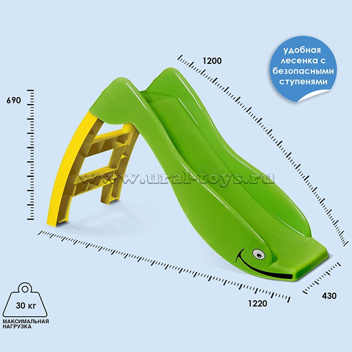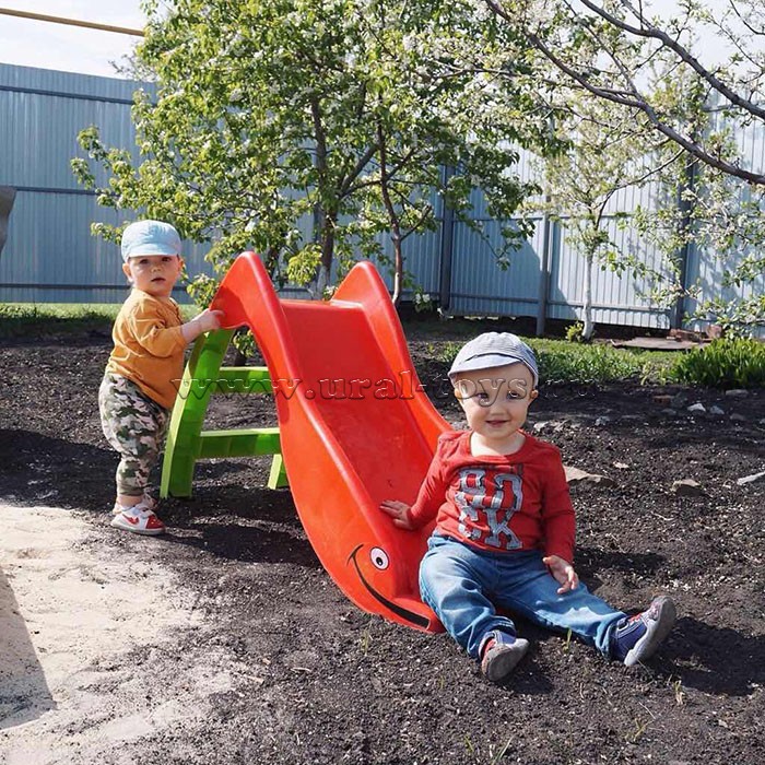1 шт. Горка стилизована под дельфина. Яркая небольшая горка для игр малышей на свежем воздухе и дома. орка оснащена удобной лесенкой с безопасными ступенями, устойчива и надежна. А когда ребенок будет скатываться, установленные по бокам бортики, не позволят упасть. Быстро собирается и разбирается. Инструкция по сборке прилагается. • Размер (ДхШхВ): 122х43х69 см. • Выполнена из высококачественного пластика, устойчива к воздействию солнечных лучей и других природных явлений. • Цвет: зеленый/фиолетовый. • Вес: 3.1 кг. • Соответствует требованиям безопасности продукции. • Рекомендуемый возраст: от 3-х лет. • Максимальная нагрузка: 30 кг.