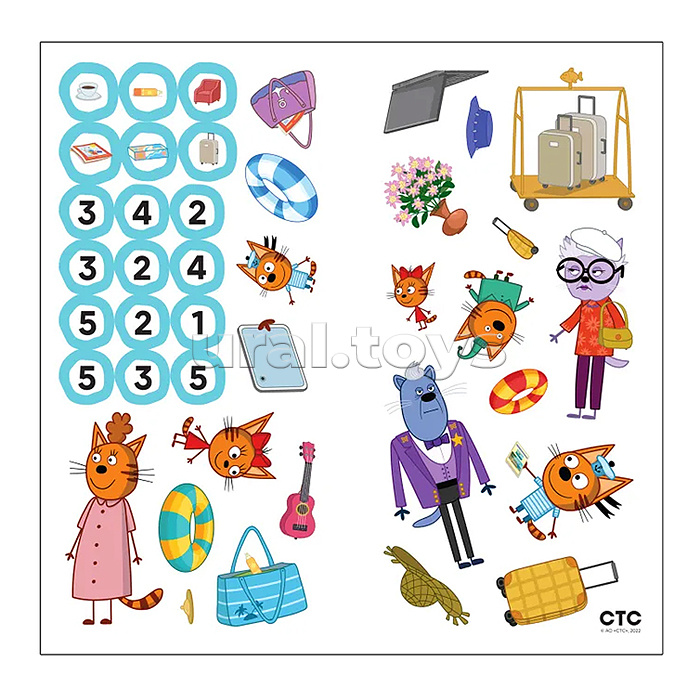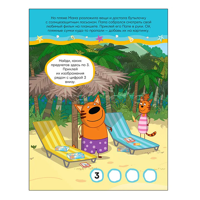 Захватывающие приключения трех котов, знакомства с новыми героями и многоразовые наклейки, а также увлекательные задания на обучение счету - все это внутри книги