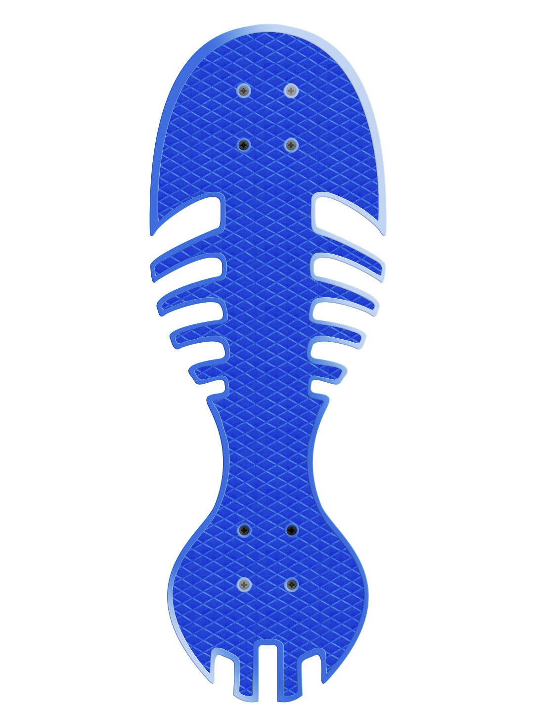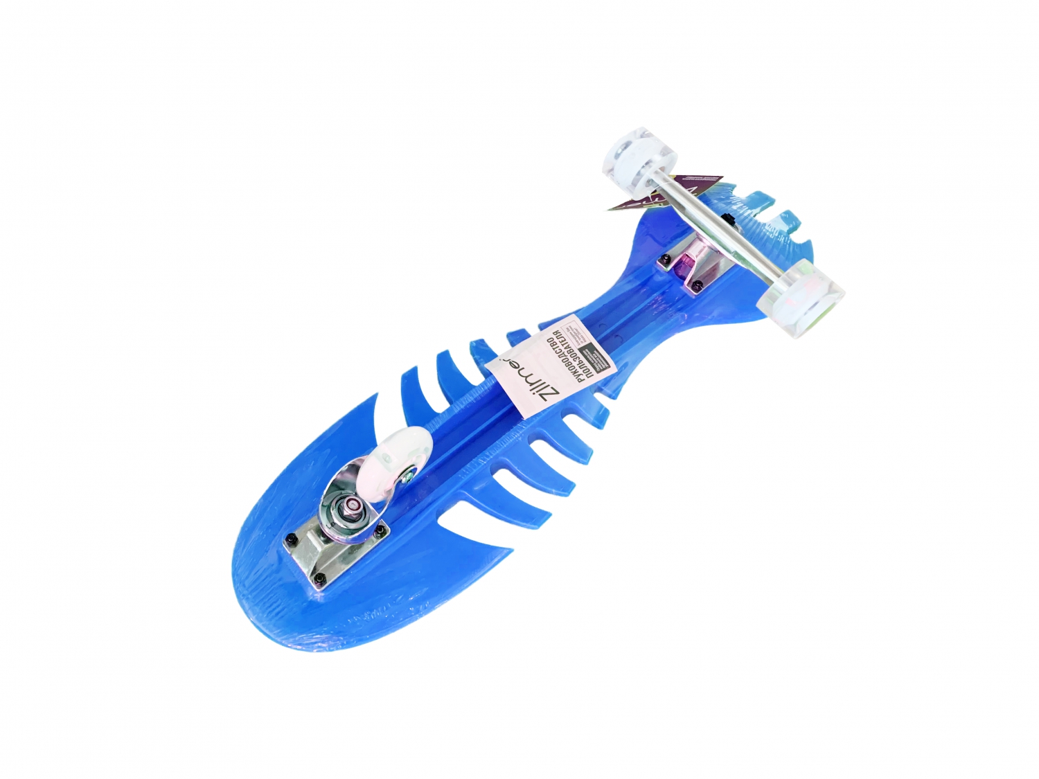 Особенной чертой скейтборда является тего необычный внешний вид. Дека оснащена антискользящим покрытием. Три полиуретановых колеса 60х45 мм обеспечивают большую устойчивость, хорошее сцепление с поверхностью, быстрый разгон и торможение. Кроме то они ярко светятся, привлекая внимание! Подшипники ABEC-7.
