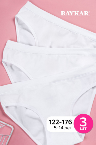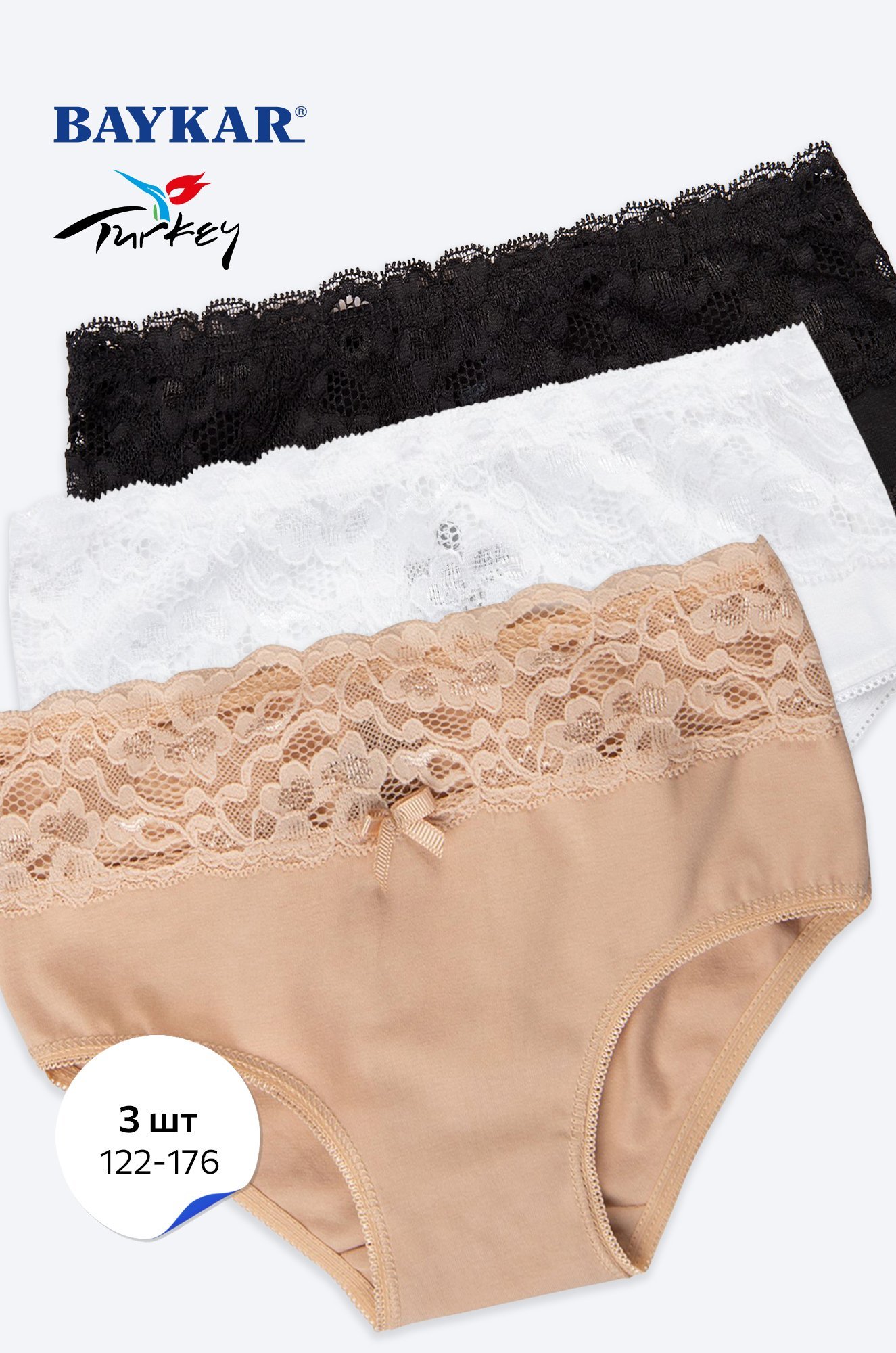 Комплект трусиков для девочки и девочек подростков выполнены из натурального хлопка. Трусы представлены в базовом цвете и украшены нежным прозрачным кружевом на поясе и милым атласным бантиком.