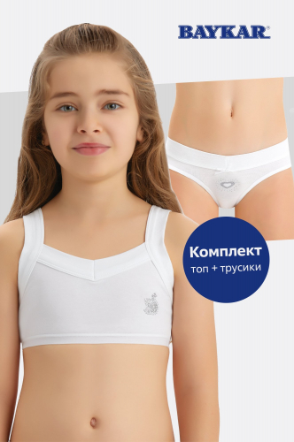 Лифчик для девочки и трусы слипы украшены атласными бантиками. Майка-топ на тонких бретелях не стесняет движений, а хлопковые трусики-слипы с мягкой резинкой приятно прилегают к телу.