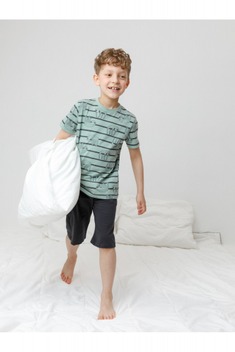 Трикотажная пижама из натурального хлопка. Футболка с короткими рукавами . У шорт эластичный пояс на резинке. Оригинальная набивка выполнена из стойких, гипоаллергенных текстильных красителей. Пижама сохраняет цвет и форму после многократных стирок. Все трикотажные полотна производятся в соответсвии с нормами Швейцарского сертификата ЭкоТекс.
