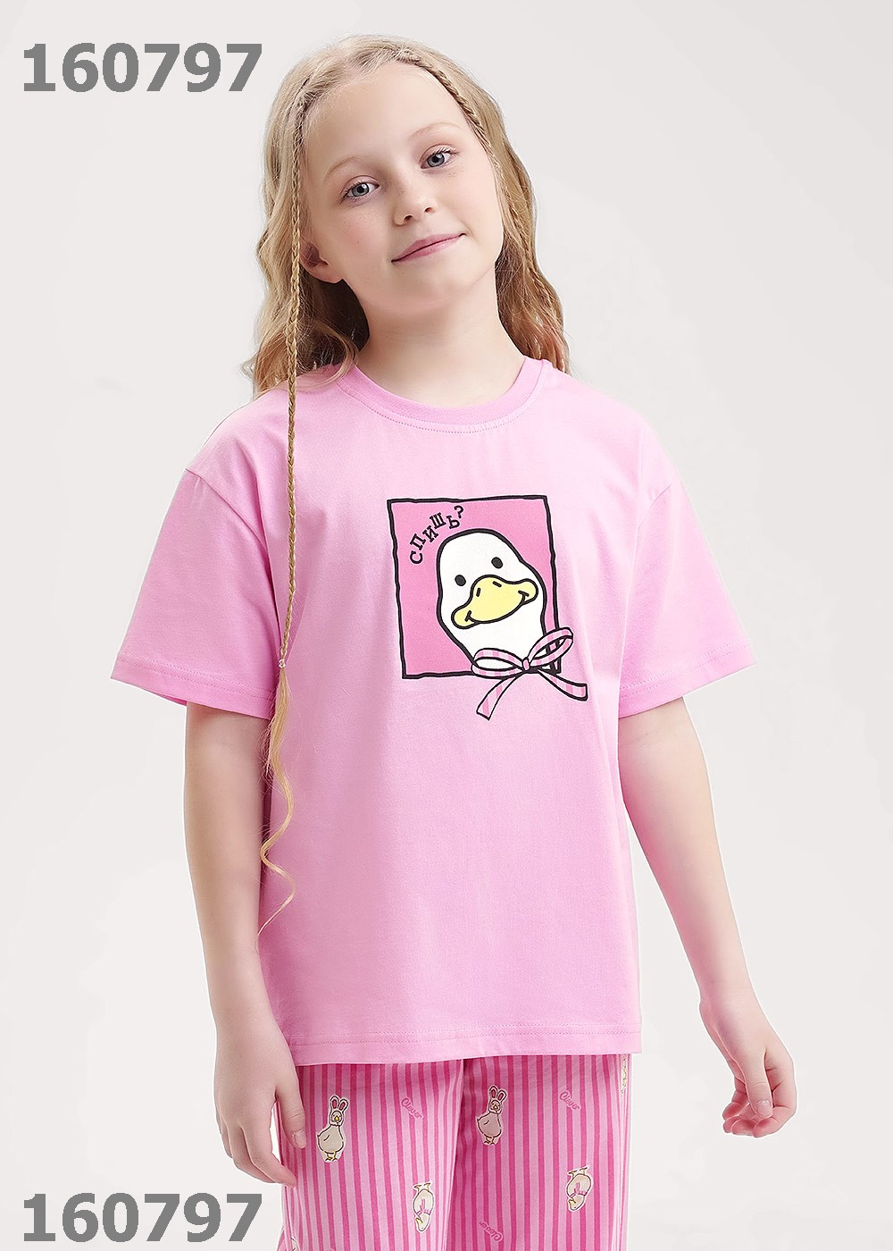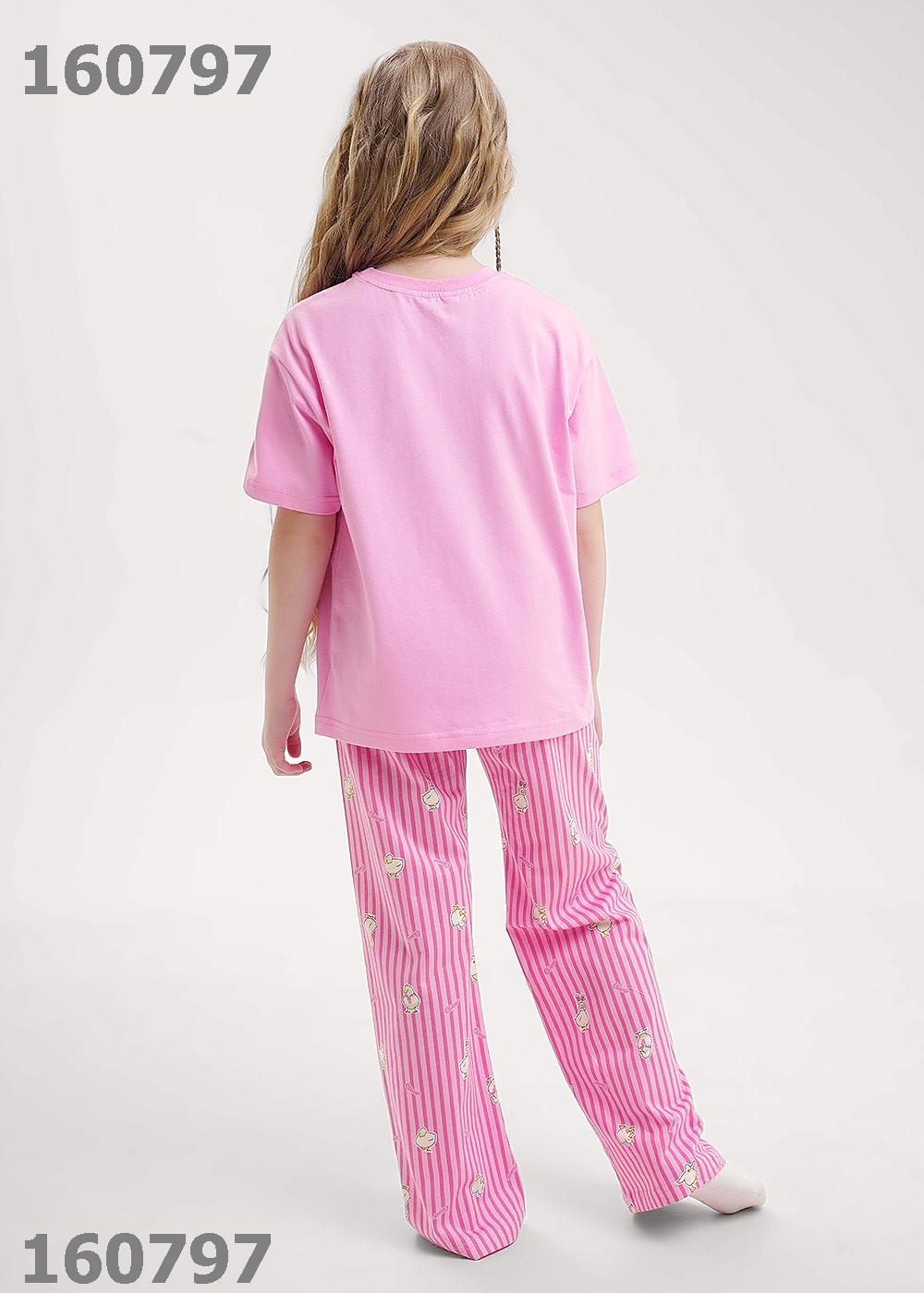 "Описание: Комплект хлопковой пижамы из футболки и брюк. Футболка свободного кроя дополнена эластичной горловиной и стильным принтом. Брюки среднего объема, эластичный пояс обеспечит комфорт и идеальную посадку, а стильная набивка подарит хорошее настроение.