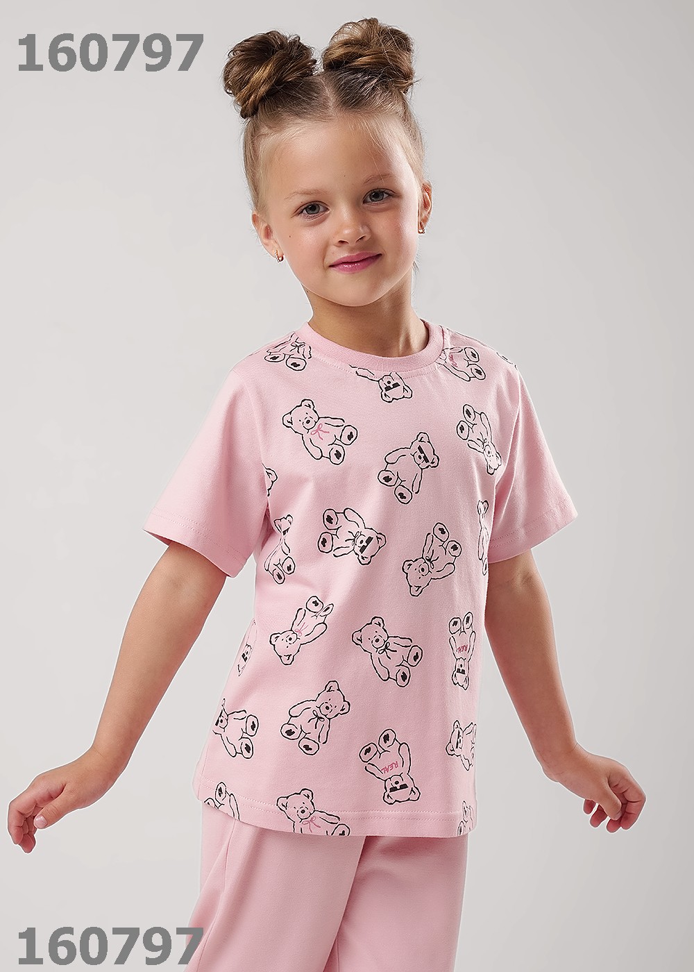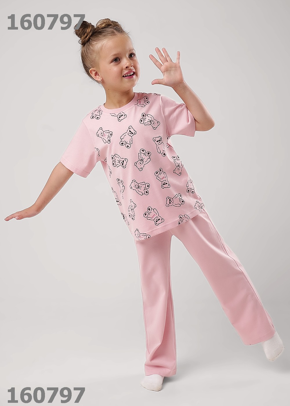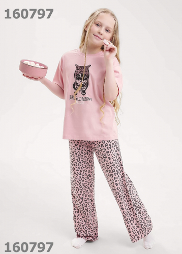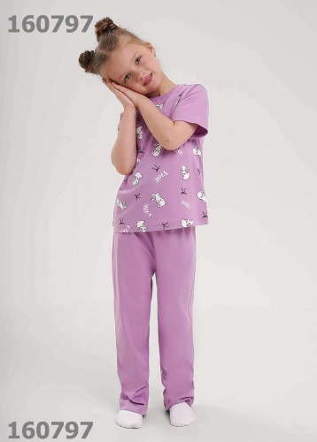 "Описание: Комплект хлопковой пижамы из футболки и брюк. Футболка свободного кроя дополнена эластичной горловиной и стильным принтом- набивкой. Брюки свободного покроя, эластичный пояс обеспечит комфорт и идеальную посадку.